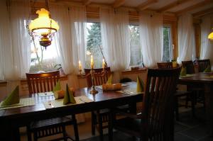 Hier sehen Sie den Gastraum unseres Landcafés mit Wintergarten.